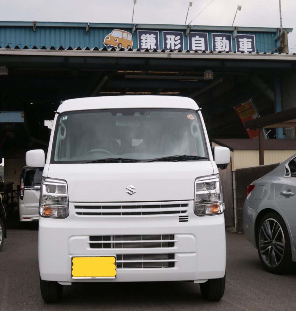 長年ご利用いただいているお客様へ、スズキ・エブリィV新車の納車です。以前乗っていたお車が故障してしまい急遽車が必要になり購入。1ヵ月お待ちいただきましたが無事に納車出来ました。